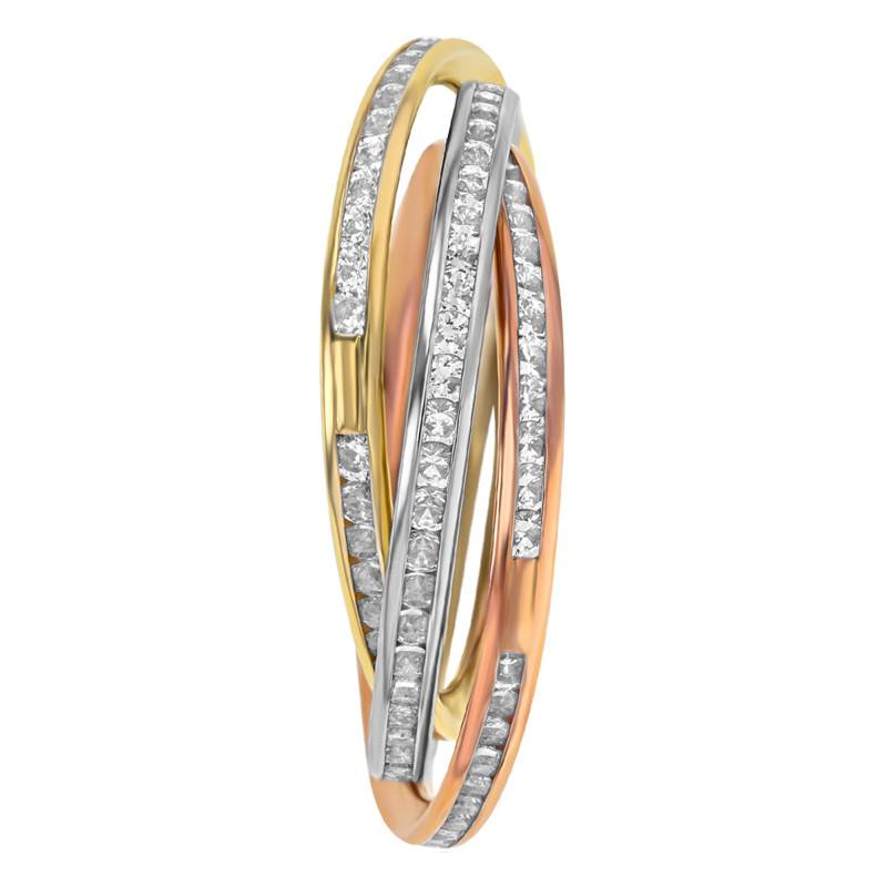 Découvrez ici cette sublime bague composée de trois anneaux entrelacés confectionnée en or jaune, blanc et rose. Chacun des anneaux de 1.53 mm d'épaisseur est serti de magnifiques oxydes de zirconium d'un diamètre de 1 mm. Ce bijou est tendance, charmant, léger et facile à porter. Vous pouvez l'associer à d'autres bijoux et rehausser le caractère de vos tenues.