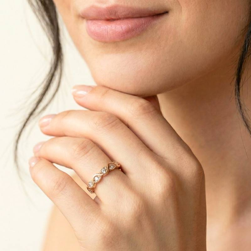 Cette alliance en Or Rose 375/1000 (9K) séduit par son allure raffinée et sa finition polie et brillante. Elle se distingue par une bande centrale composée de neuf diamants, délicatement sertis à griffes, offrant un poids total de 0,23 carat. Un fin fil d'or rose, subtilement ondulé, vient se glisser entre les pierres, apportant une touche de douceur et de modernité à l'alliance.