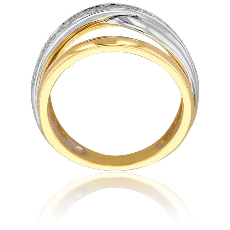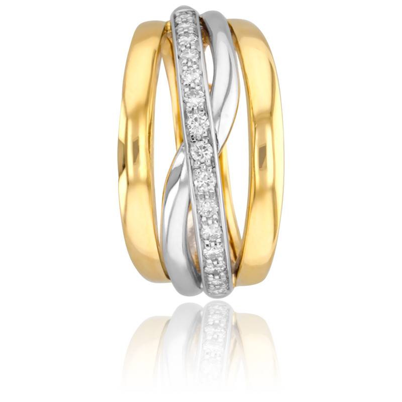 Ocarat vous présente ce bijou unique ! Cette bague en or jaune et or blanc 750/1000 (18K) apportera une touche d'élégance à vos tenues. Les courbes et croisements des anneaux créent un sublime effet d'entrelacement. Les quinze diamants brillants sont sertis à grains, pour un poids total de 0,23 carat, une couleur H et une pureté SI1. Cette bague a une largeur de 5 mm pour une épaisseur de 4 mm.