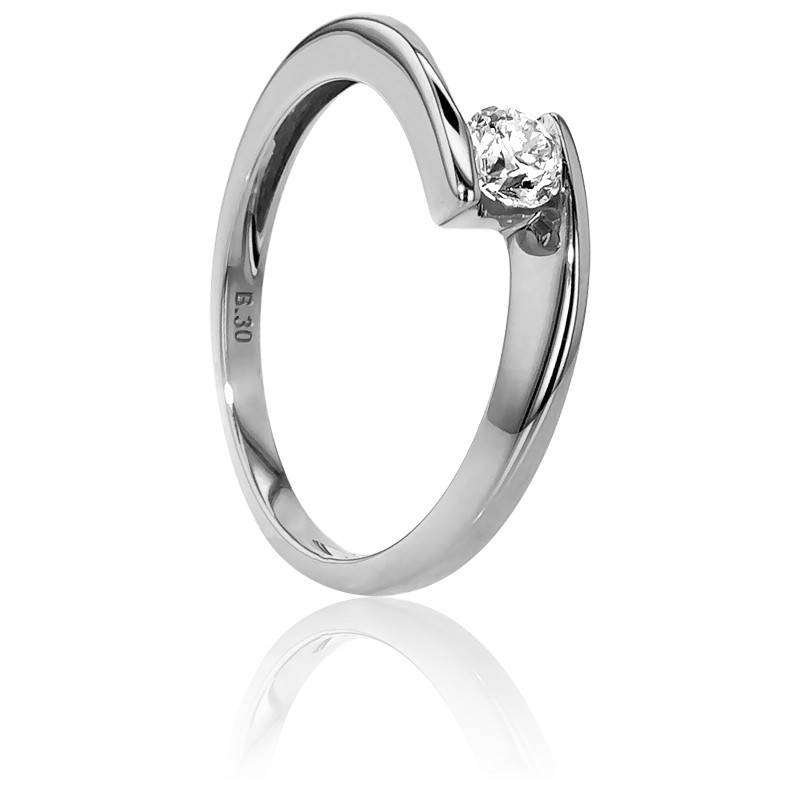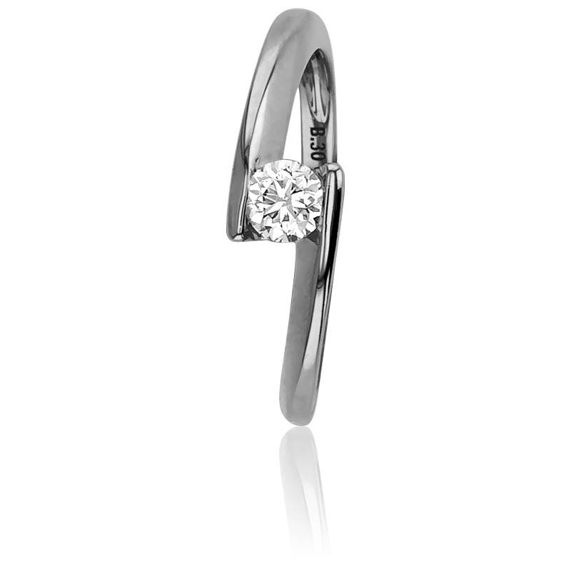 Le diamant est mis en valeur, presque en apesanteur, et est enchâssé dans l'écartement de la monture.