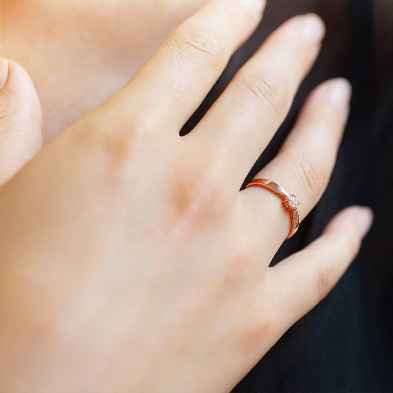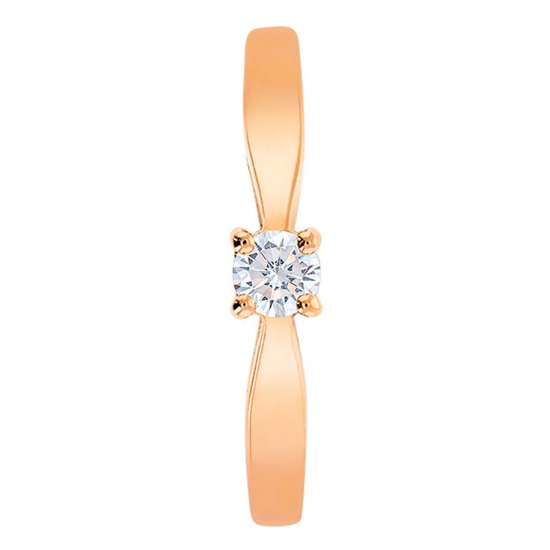 Idéal pour une demande en mariage, cette ravissante bague épurée et moderne, se compose d'or rose 750/1000 (18K) pour un poids de 1,18 gramme. Ce scintillant diamant solitaire de 0,15 carat est posé sur un chaton laissant passer la lumière afin de révéler la brillance du diamant. Serti de 4 griffes, le diamant a une couleur H et une pureté SI.