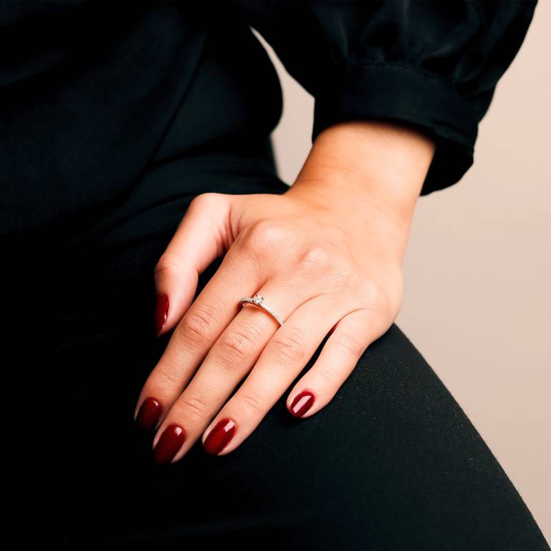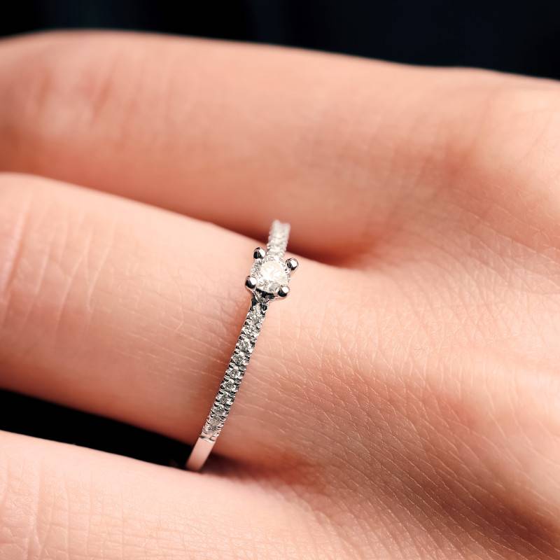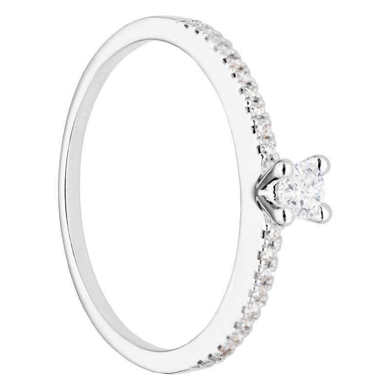Ce Solitaire Accompagné en Or blanc et Diamants émerveille par sa délicatesse et son éclat. Forgée en Or Blanc 750/1000 (18K), cette alliance est à la fois légère et précieuse, avec un poids total de 1,80 g. Sa finition polie et brillante capte la lumière de manière exquise, sublimant chaque facette. Le diamant central, serti à griffes, arbore une couleur blanche immaculée, sa pureté SI1 révélant une clarté presque onirique. D'un poids de 0,09 ct, il est accompagné de pierres de pavage également en diamant, portant à 0,18 ct le poids total en carats.