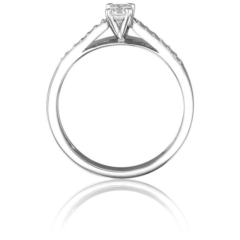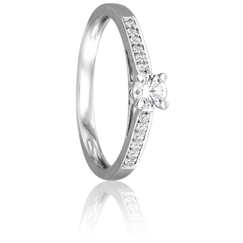 De part et d'autre de la pierre centrale, l'anneau est pavé de 12 diamants taille brillant et sertis grains, d'un poids total de 0,10 carat.