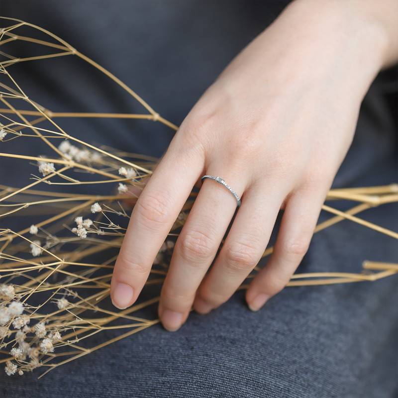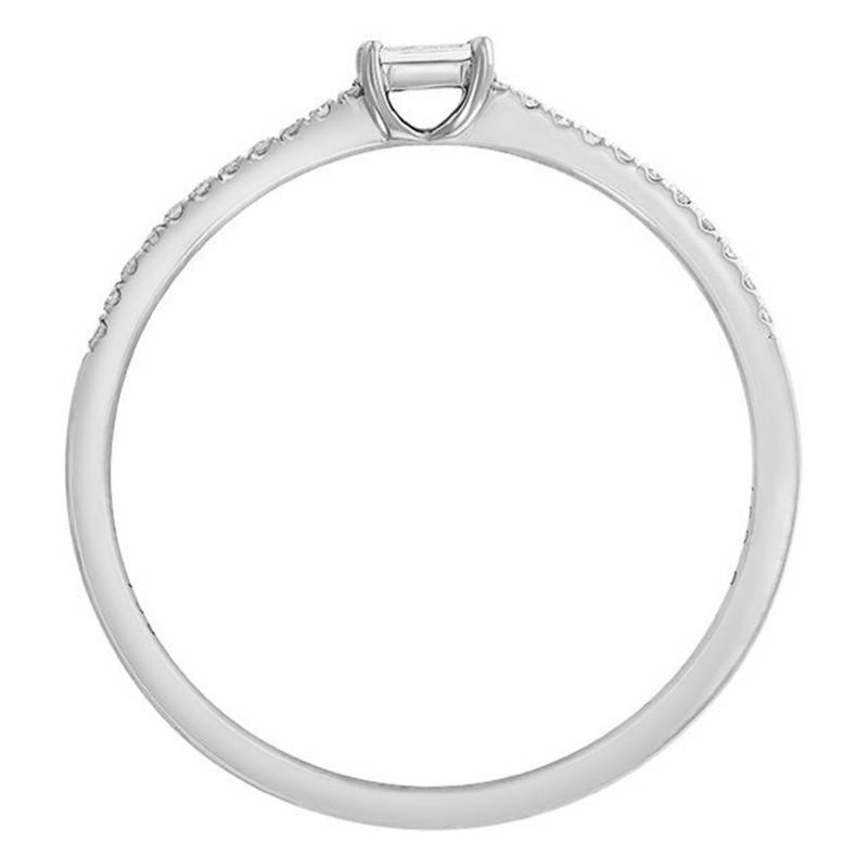 Pour accompagner ce diamant baguette, vous retrouverez un pavage de multiples diamants qui habillent le corps de la bague avec une luminosité impressionnante. Les diamants ont un poids total de 0,10 ct. La couleur des diamants est classifiée H et leur pureté SI. Le corps de bague quant à lui est d'une largeur de 1 mm pour un poids moyen de 1,10 gramme.
