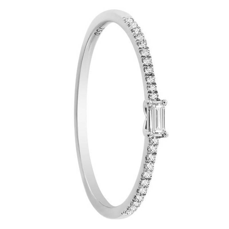 Choisissez une bague de fiançailles qui vous ressemble ! La marque Divine vous propose ce ravissant modèle et son design unique. En or blanc 750/1000 (18K) ce modèle met en avant un diamant taillé en format baguette. Son aspect minimaliste est moderne et élégant et saura habiller votre main en toute simplicité.