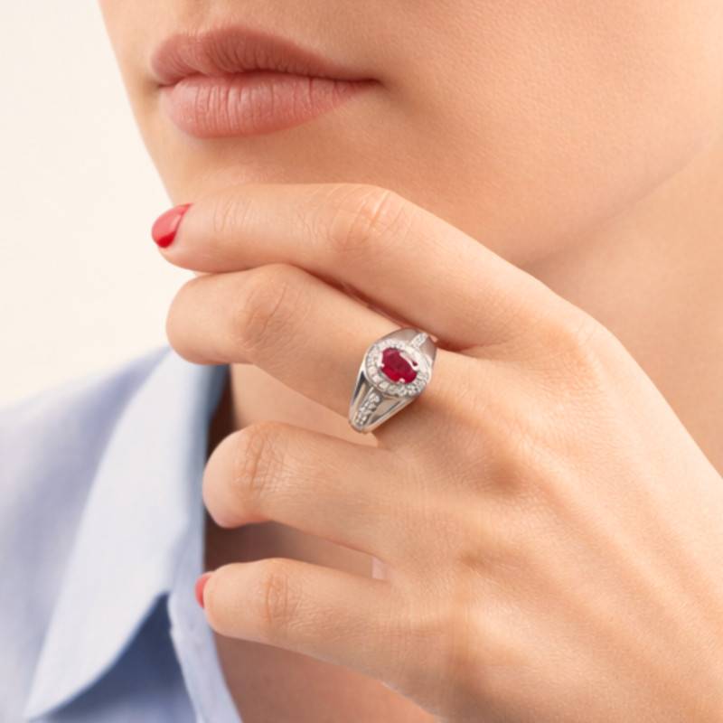 Au centre de chaque tige, se trouve une suite de diamants sertis à griffes reflétant un éclat charmant. Le rubis dispose d'un caratage de 1 ct alors que les 26 diamants sont de 0,32 ct. De même, le poids de l'or moyen est de 4 grammes pour la taille 54 mm.