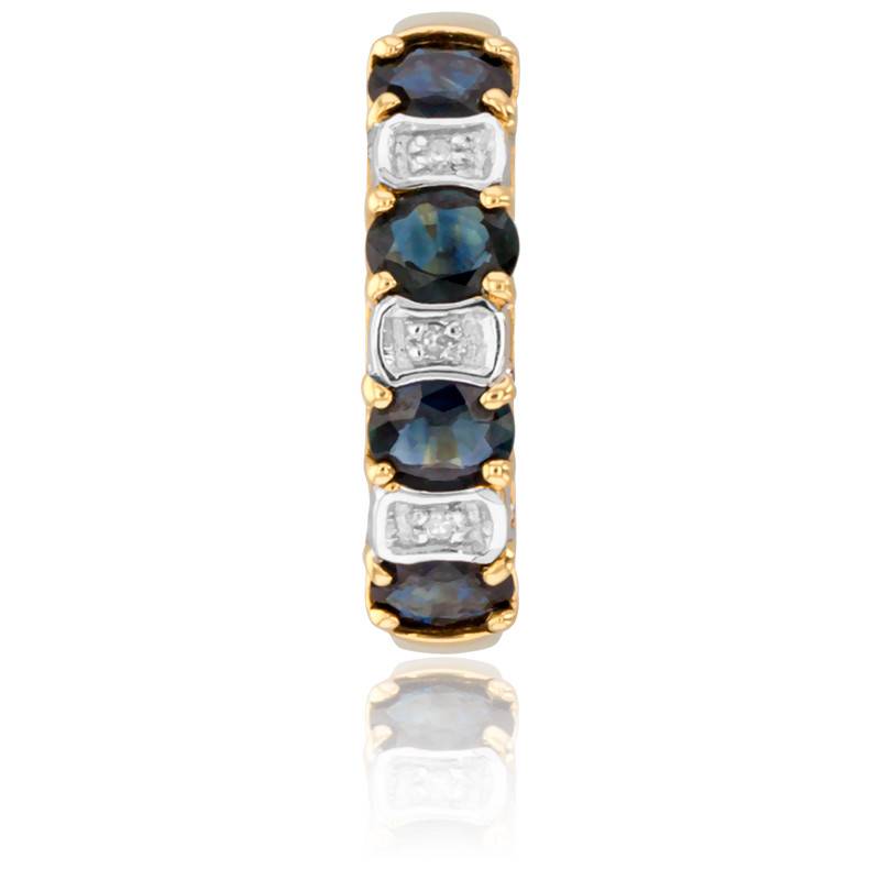 Romantique et délicate, cette sublime bague en or jaune 750/1000 (18K) apportera une touche d'élégance à vos tenues. La tête de bague est composée de quatre saphirs de 1,16 carat chacun, et de trois diamants qui s'alternent. Les saphirs brillants sont sertis quatre griffes, tandis que les diamants sont sertis clos pour un poids total de 0,02 carat, une couleur H et une pureté SI1.