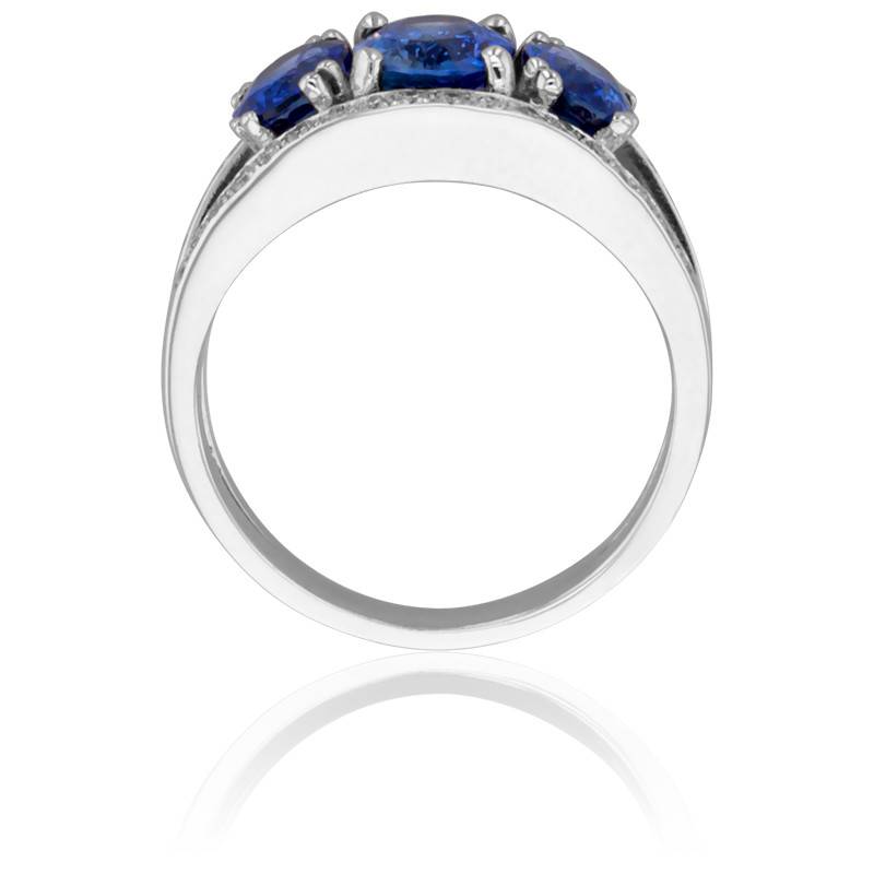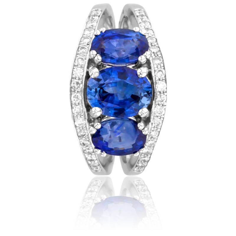 Cette bague or blanc diamant et saphirs apportera une touche d'élégance à vos tenues. La tête de bague est composée de trois saphirs sertis à grains, dont le central plus massif. Celui-ci fait 8 x 6 mm pour 1,50 carat, tandis que les deux autres font 6 x 4 mm pour 1,20 carat chacun. Les trente-six diamants encadrent cette sublime tête de bague et pavent le double anneau. Ces diamants brillants sertis à grains ont une poids de 0,29 carat, une couleur H et une pureté SI1. Ce bijou en or blanc 750/1000 (18K) est signé de la Maison Porchet.