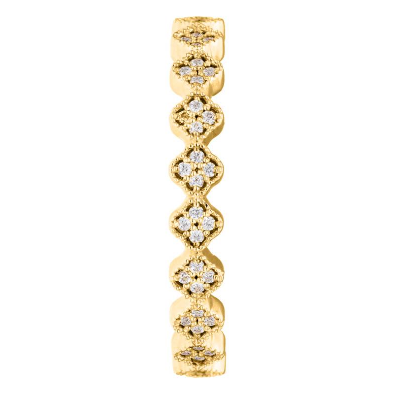 Découvrez la Bague Trèfles Perlés en Diamants 0,11ct & Or jaune 375. Réalisée en or jaune 375/1000, elle présente une finition polie et brillante qui met en valeur son design fin et épuré. Son motif trèfle est sublimé par 40 diamants blancs, pour un poids total de 0,11 ct. Légère et agréable à porter, la bague affiche une épaisseur de 0,50 mm et un poids de 1,00 g.