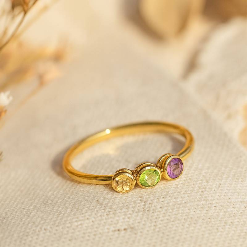 Cette fascinante bague trilogie est faite pour vous ! Fabriquée en or jaune 375/1000 (9K), elle sera l'addition parfaite qui rehaussera votre tenue aussi bien chic que décontractée, vous conférant une allure fraîche. D'une épaisseur de 1,30 mm, son anneau apportera un éclat saisissant à votre main grâce à sa finition polie. Il est rehaussé au centre par une citrine, un péridot et une améthyste,toutes s erties clos.