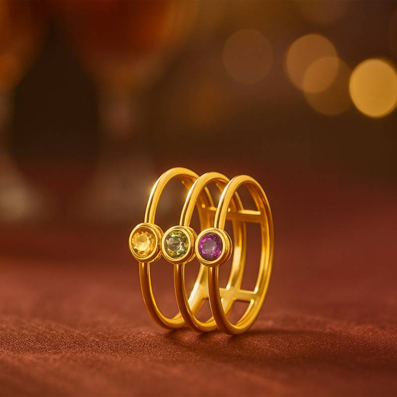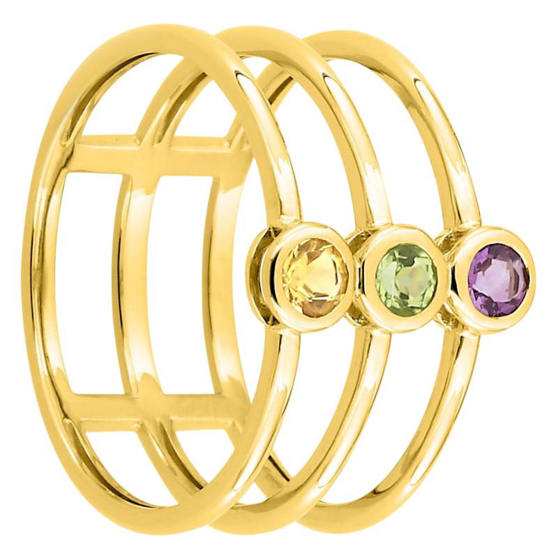 Cette ravissante bague est fabriquée en or jaune 375/1000 (9K) et est dotée d'une finition polie qui souligne son charme en lui accordant une note rayonnante. Liés par deux barres, ses trois anneaux délicats et épurés glisseront sur votre doigt avec finesse en assurant un port léger et confortable. Chacun est agrémenté au centre par une pierre ronde sertie clos. Il s'agit d'une améthyste, d'un péridot et d'une citrine. Scintillantes de mille feux, ces trois gemmes de 2,50 mm de diamètre chacune apporteront à votre main une touche d'éclat sophistiquée. Elle mesure 10 mm de largeur et dévoile un poids de 2,50 grammes.