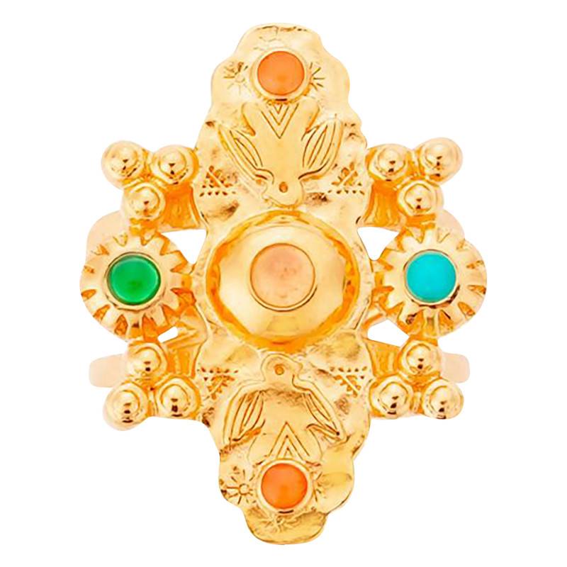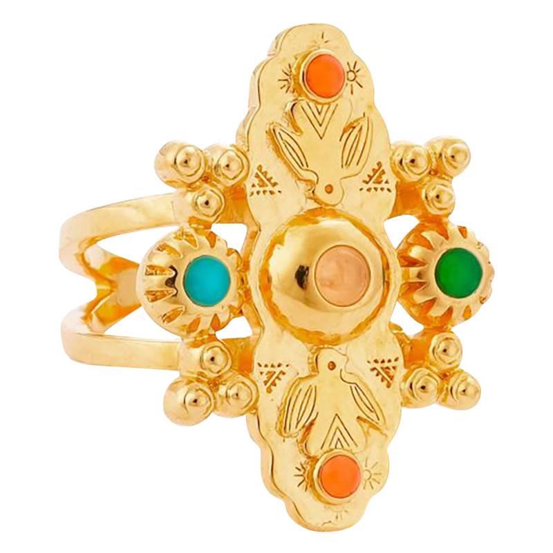 Découvrez cette belle bague Varda dorée dont le design s'apparente à un totem sioux. Elle comprend une finition brillante et des pierres émaillées aux teintes d'ocre, de rouille, de turquoise et de grenat. Son allure imposante la rend idéale pour un port quotidien ou pour sublimer une tenue lors d'occasions spéciales. Notez que ce modèle en laiton plaqué or jaune 585/1000 (14K) mesure 26 mm de hauteur. L'ouverture de cette bague pour femme vous permet de la porter facilement et de l'ajuster selon votre convenance.