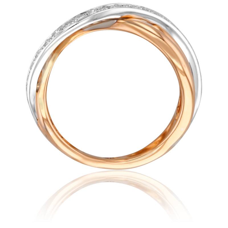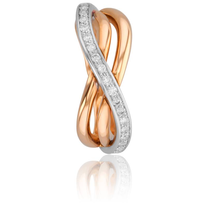 Romantique et délicate, cette sublime bague en or blanc et or rose 750/1000 (18K) apportera une touche d'élégance à vos tenues. Originale, moderne et féminine, elle plaira à coup sûr. Les courbes des anneaux et leur croisement créent un effet d'entrelacement. Les vingt-huit diamants brillants sont sertis à grains, pour un poids total de 0,35 carat, une couleur H et une pureté SI1. Cette bague a une largeur de 4 mm pour une épaisseur de 3 mm pour un poids d'or moyen de 5,66 grammes.