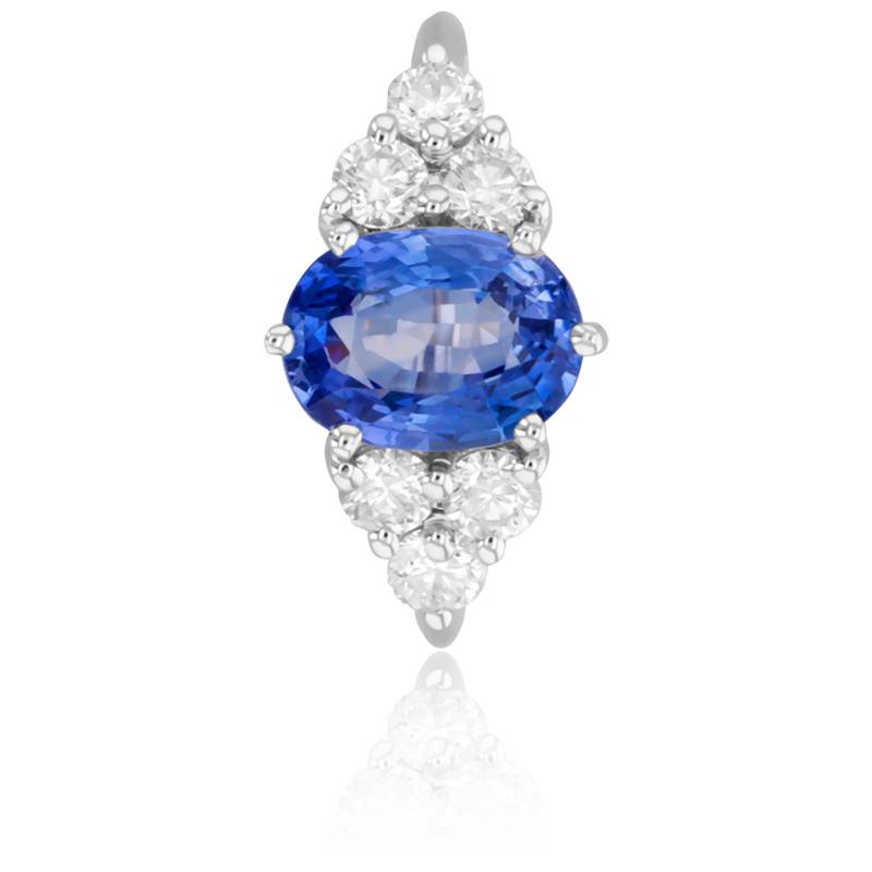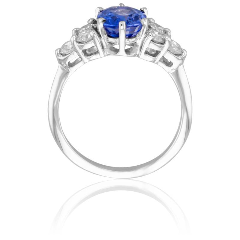 La pierre centrale est un saphir de Ceylan. De taille ovale, il mesure 9 x 7 mm pour un poids total de 2,40 carats. Afin de révéler tout l'éclat et la couleur de la pierre, elle est serti six griffes. Le pavage de diamants brillants sertis à grains vient étoffer la tête de bague. Ainsi, trois diamants ceinturent le pierre centrale à ses deux côtés. Les diamants de couleur H et de pureté SI1 ont un poids total de 0.56 carat.