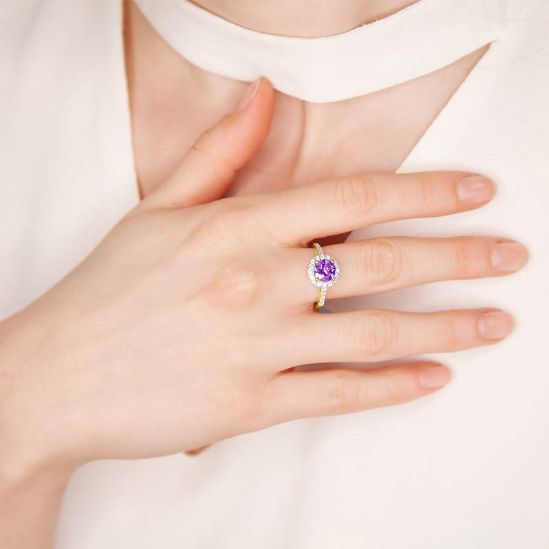 Vous voulez faire plaisir à madame et marquer le coup ? N'attendez plus et craquez pour cette somptueuse bague en or jaune 750/1000 (18K). Moderne et raffinée, elle est digne de la haute joaillerie et est intemporelle pour suivre votre partenaire de nombreuses années. Mélangeant diamants et améthyste, elle se marie à la perfection toutes tenues. C'est donc une magnifique pierre d'améthyste de 1.55 carat qui habille le centre de la bague. Le violet intense et hypnotisant, s'associe à la brillance du pavage de 26 diamants qui l'accompagne. Sertis à grains, de couleur GH et de pureté SI1, ces diamants habillent le corps et la tête de bague avec leur poids de 0.41 carat.