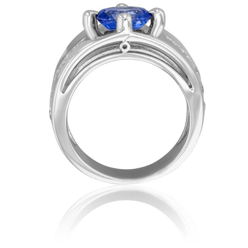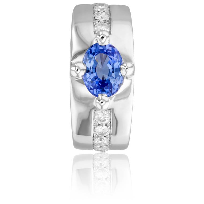 Romantique et massive, cette sublime bague en or blanc 750/1000 (18K) apportera une touche d'élégance à vos tenues. La pierre centrale est un saphir de Ceylan de forme ovale. Il mesure 8 x 6 mm pour un poids total de 1,50 carat. Pour révéler tout son éclat, la pierre est sertie quatre griffes.