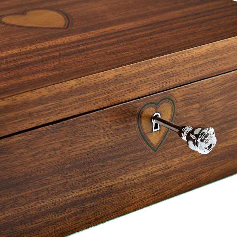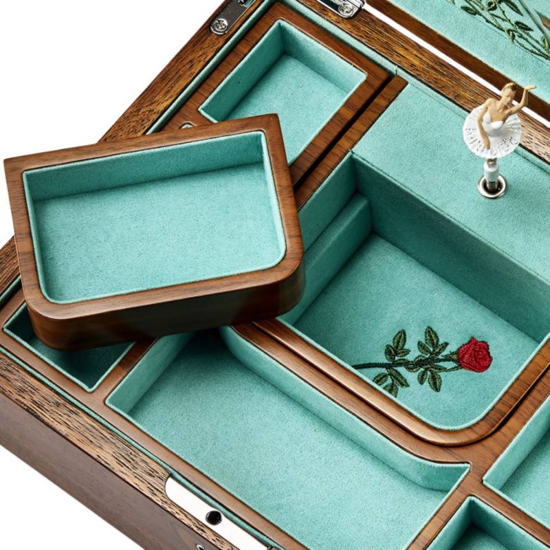 À l'intérieur, l'espace est organisé pour accueillir et protéger vos bijoux. Il comprend 8 compartiments habillés d'une doublure LusterLoc™ turquoise, conçue pour aider à prévenir le ternissement. Un miroir en forme de cœur et un décor brodé représentant le château et la roseraie complètent l'intérieur. La boîte est également dotée d'un mécanisme musical : à l'ouverture, deux ballerines interchangeables peintes à la main, tournent sur la Valse de La Belle au bois dormant de Tchaïkovski. Une clé à thème rose vient compléter l'ensemble.