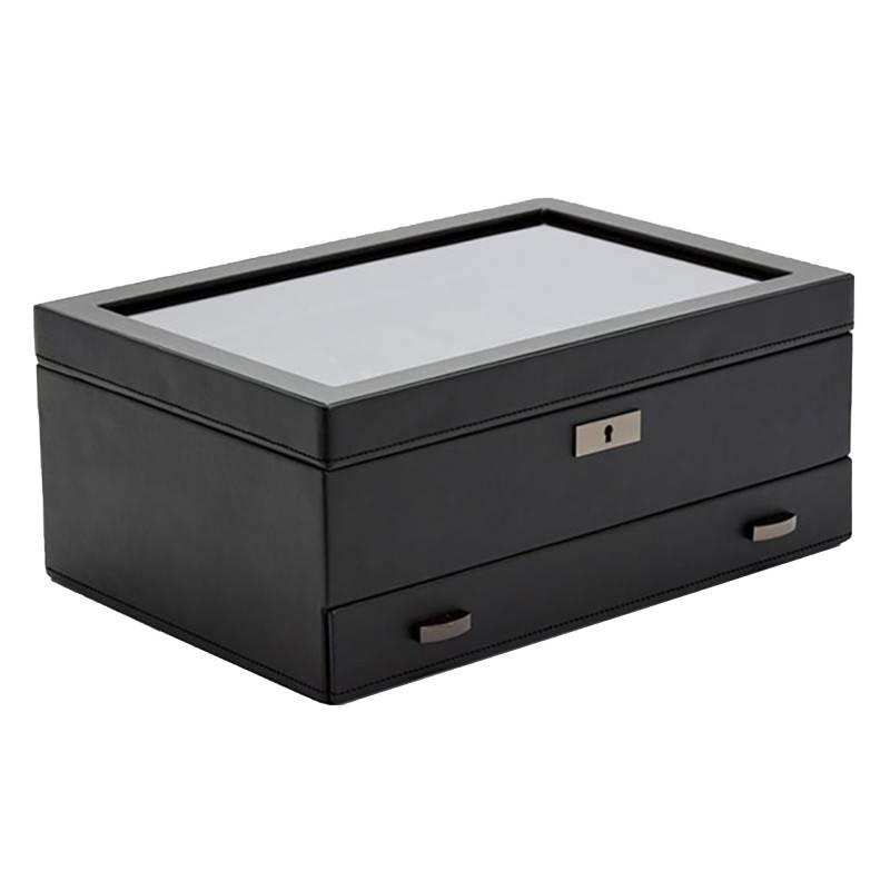 Habillé d'un élégant revêtement noir en polyuréthane d'origine végétale (PU végétal), ce coffret séduit par son design sobre et contemporain. Son couvercle s'ouvre sur un espace supérieur équipé de coussins dédiés au rangement de plusieurs montres, permettant de les conserver en toute sécurité tout en les exposant avec élégance. Le couvercle intègre également une large vitre qui offre une vue claire sur votre collection tout en la protégeant de la poussière.