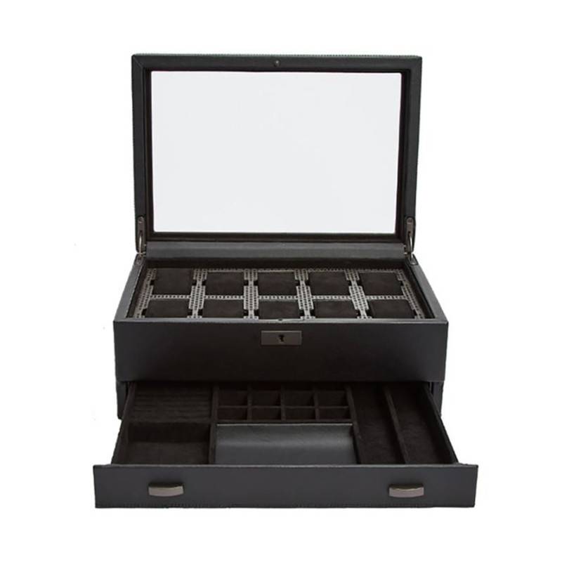 Fonctionnel et ingénieusement conçu, ce coffret dispose également d'un tiroir inférieur compartimenté. Celui-ci permet d'organiser facilement bracelets, bijoux ou accessoires horlogers, offrant ainsi un espace de rangement complet et parfaitement structuré.