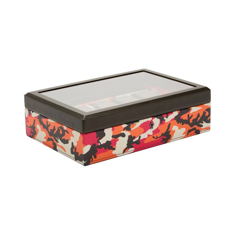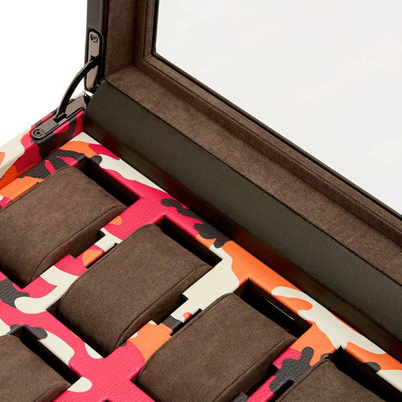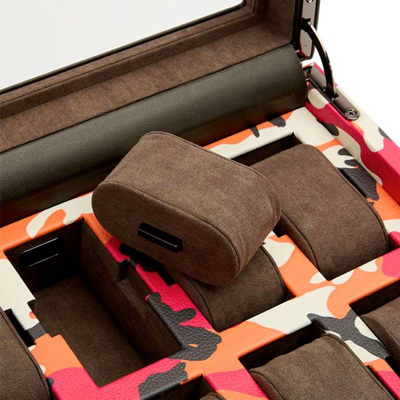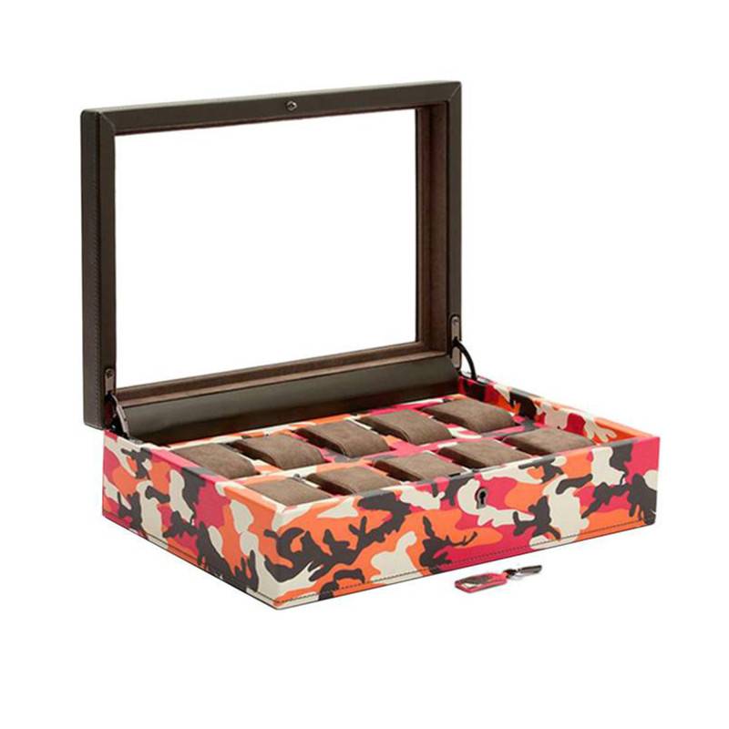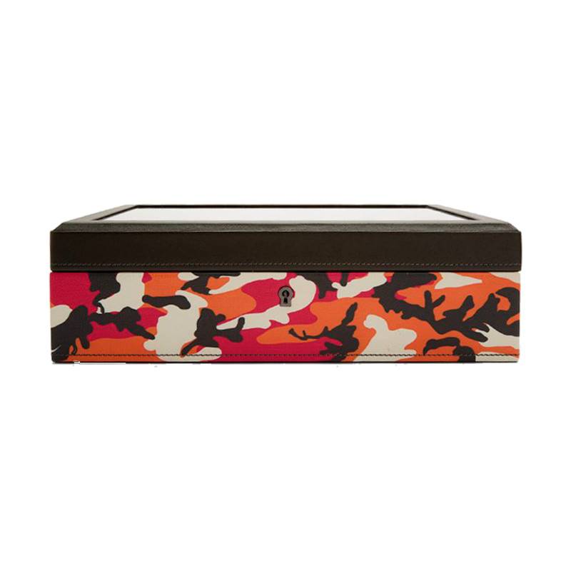 Entièrement faite en cuir à tannage végétal, cet accessoire arbore des couleurs chaudes telles que l'orange et le rose qui font penser au magenta du feu. Le blanc et le noir qui les accompagnent atténuent l'intensité de ces dernières. Cette boîte à montres possède une forme rectangulaire et un couvercle transparent, qui laisse voir les différents coussins dans lesquels vous pourrez ranger vos montres. Elle comprend au total 10 compartiments ainsi qu'un port USB de la montre intelligente. Cette boîte sécurisée bénéficie d'une serrure et d'une clé, ainsi, vous pourrez garder vos garde-temps en toute sécurité.