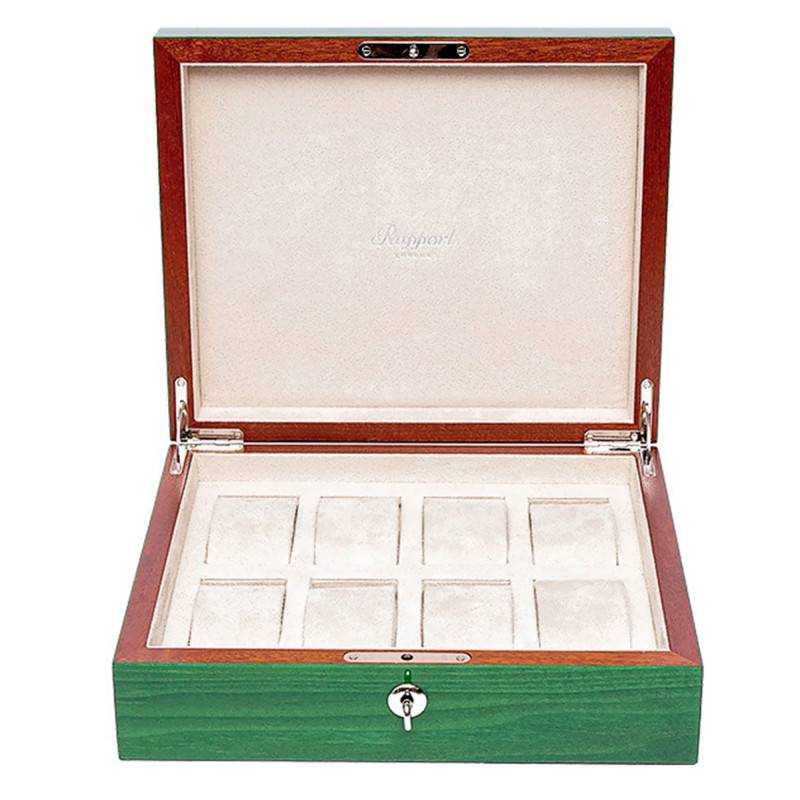 La collection Héritage ne fait pas exception à la règle. Cette boîte de montre réalisée à la main en bois de cèdre. Sa très jolie couleur verte est brillante grâce à plusieurs couches de laque. L'intérieur est doublé en daim et possède un aspect luxueux. Vous pourrez ranger et protéger jusqu'à huit montres grâce à cette boîte. Cet élégant coffret dispose d'une serrure et d'une clef et mesure 330 x 90 x 250 mm.
