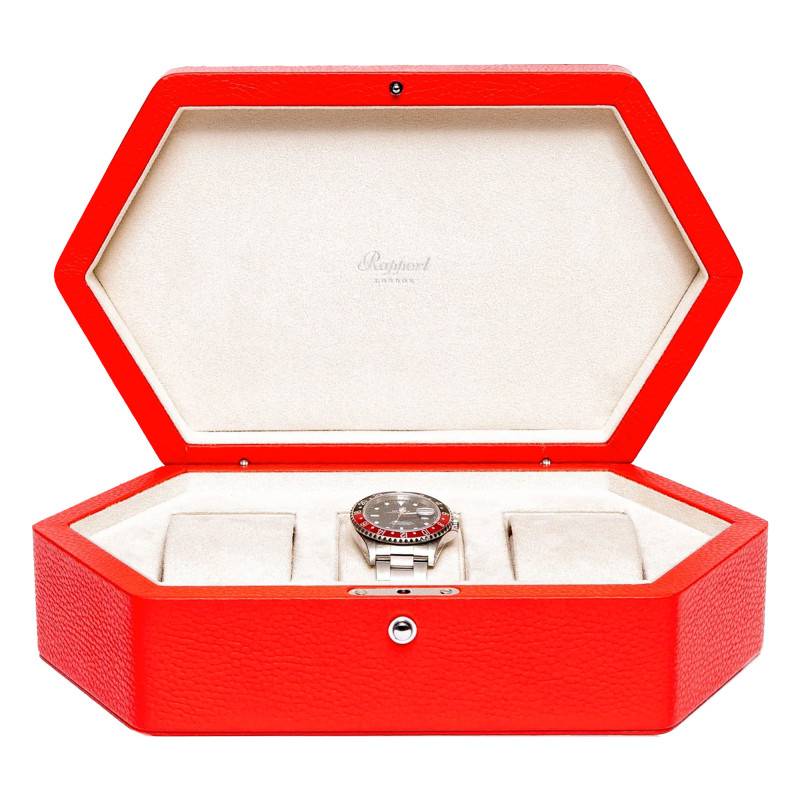 Inspirée des ruelles colorées et vibrantes de Notting Hill, cette boîte à montres TA42 est épatante. Issue de la collection Portobello, elle est fabriquée à la main en bois et est recouverte d'un cuir grainé de première qualité. Sa couleur rouge dessine à merveille sa forme hexagonale faisant ressortir le charme et l'élégance de la pièce. Elle vous permettra de ranger et de garder en sécurité jusqu'à trois de vos précieuses montres. Son intérieur est doublé d'un daim beige crème et est marqué par le nom de la marque sur le couvercle. Elle est munie d'un bouton poussoir qui vous permettra de la verrouiller facilement.