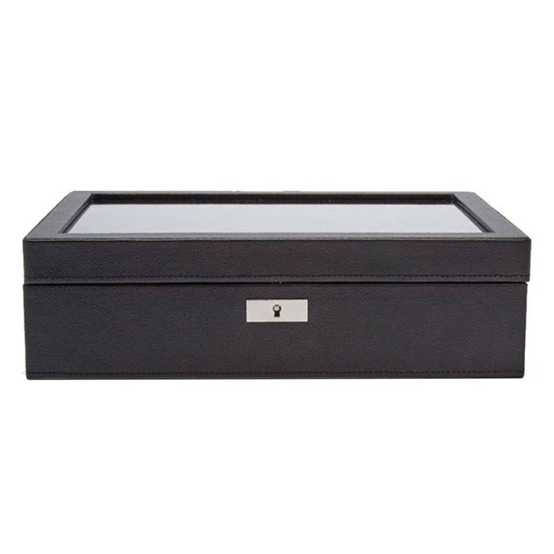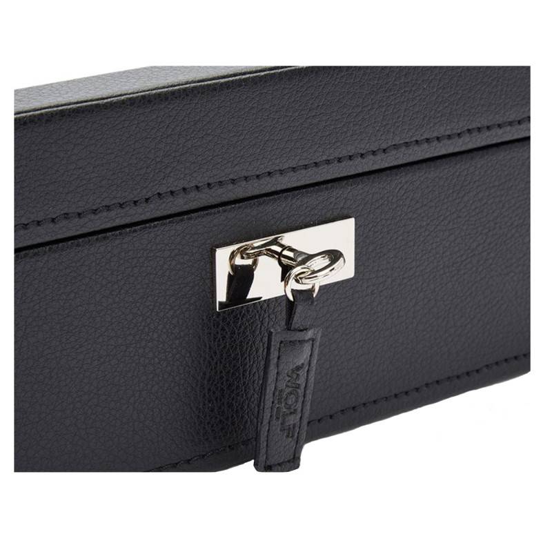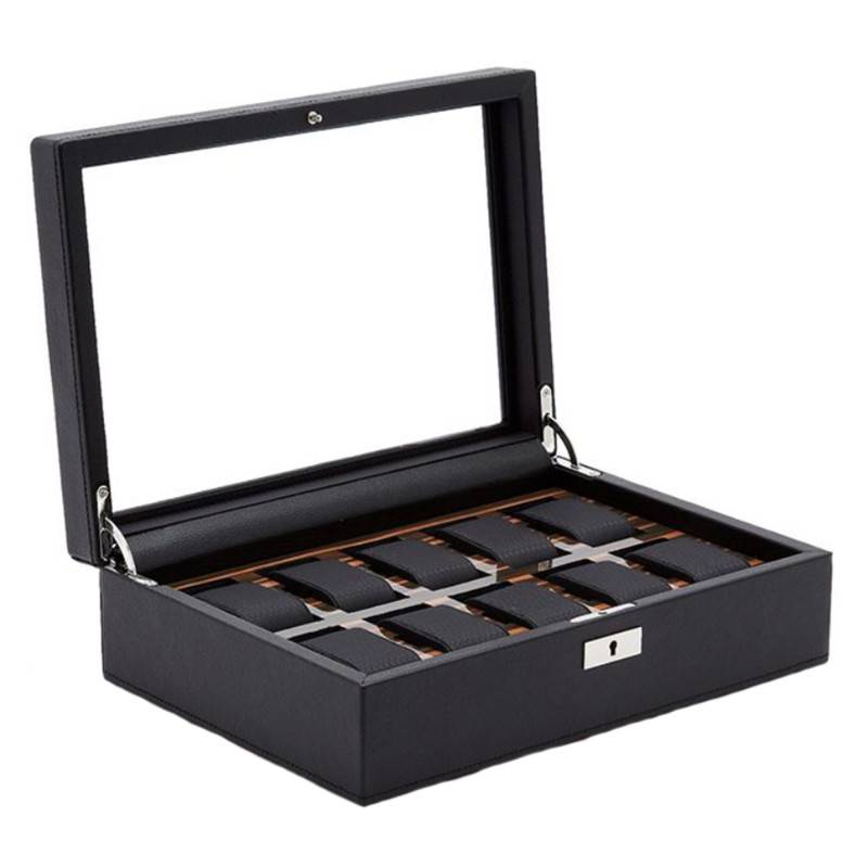 WOLF est une entreprise familiale qui fabrique des sublimes écrins et boîtes de rangement servant à protéger vos précieux bijoux et garde-temps. De sa collection Roadster, elle vous propose cette élégante boîte à montres de couleur noire. Conçue en cuir de bovin avec un tannage végétal, celle-ci possède 10 emplacements pour montres. Chaque compartiment dispose d'un coussin suspendu pour un bon maintien et une meilleure protection. Cette boîte affiche une finition grainée et des détails polis en bois ébène de macassar qui offrent un beau rendu esthétique. Il comporte en haut une fenêtre transparente qui vous permet d'admirer vos montres et de choisir une sans l'ouvrir. Facile à transporter, cette boîte rectangulaire mesure 32,70 cm de longueur, 22,90 cm de largeur et 9,50 cm de hauteur. Elle dispose d'une serrure et une clé argentée pour plus de sécurité en plus d'un port USB pour les montres intelligentes.