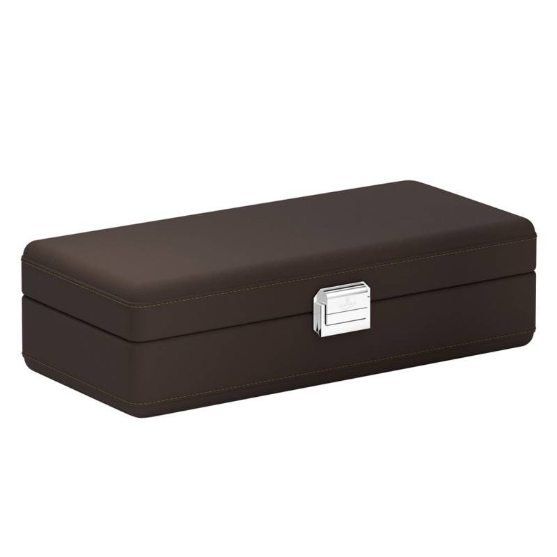 La marque vous présente cette sublime boîte à montres Valigetta 05002.MCSIL, un modèle raffiné et compact qui vous permettra de ranger et de mettre à l'abri quatre de vos précieux gardes-temps. Pesant 1 kg, elle arbore une forme rectangulaire de 30 cm de longueur, 14 cm de largeur et 9 cm de hauteur. Elle est fabriquée en cuir de vachette grainé et se pare d'une délicate teinte marron foncé. L'intérieur de cette boîte à montres est habillé en beige et accueille quatre coussins qui conviendront à merveille aux montres de taille normale ainsi qu'aux montres de grande taille avec un diamètre maximum de 56 mm, couronne incluse. Gravé par le nom de la marque, le fermoir en métal argenté assurera une fermeture et une ouverture aisées en garantissant sécurité en toute circonstance. N'hésitez plus et acquérez cette jolie boîte à montres !