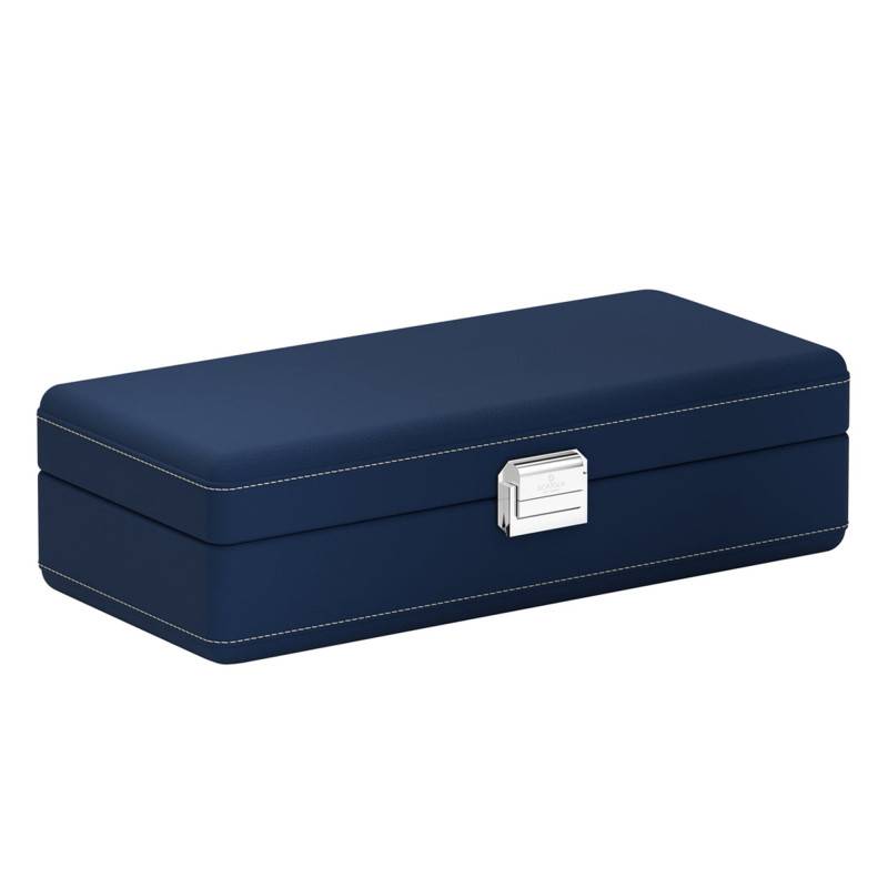 Découvrez cette nouvelle boîte à montres Valigetta 05002.BLWSIL signée Scatola del Tempoqui vous fascinera par la finesse et la délicatesse de ses lignes. Fabriquée en cuir de vachette, elle est dotée de quatre compartiments avec coussins spécialement conçus pour accueillir vos garde-temps préférés. Vous pourrez y ranger des montres de taille normale et de grande taille avec un diamètre maximum de 56 mm, incluant la couronne. Cette boîte à montres s'habille d'une belle teinte bleue avec un intérieur blanc cassé. Pesant 6 kg, elle mesure 30 cm de longueur et 9 cm de hauteur pour une largeur de 14 cm. Vous pourrez l'emporter partout dans tous vos déplacements en sécurisant vos montres grâce à son fermoir en métal argenté.
