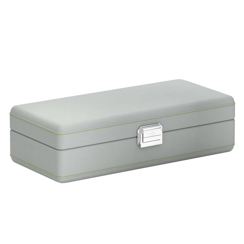 Issue de la collection Valigetta, cette boîte à montres 05002.GGRSIL saura vous émerveiller par ses couleurs vives et son design raffiné. Elle est réalisée en cuir de vachette pour un poids de 6 kg et peut héberger quatre montres dans ses compartiments. Dotés de coussins, ces derniers vous permettront de ranger des garde-temps de petite et de grande taille avec un diamètre maximum de 56 mm, couronne incluse. Cette boîte à montres de forme rectangulaire est drapée d'une sublime couleur gris clair avec un intérieur vert qui lui accorde une touche moderne. Elle mesure 9 cm de hauteur, 30 cm de longueur et 14 cm de largeur. Sa fermeture se fera au moyen d'un fermoir en métal argenté sur lequel est inscrit le nom de la maison.