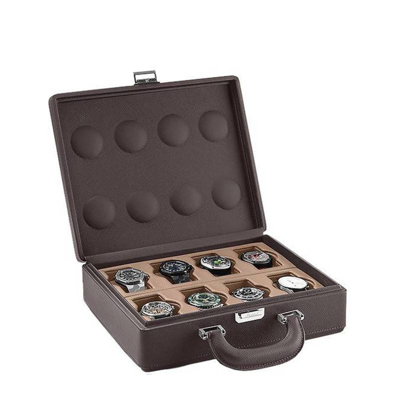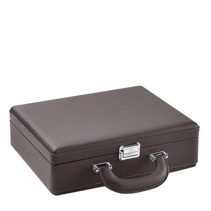 Réalisé à base de cuir de vachette, cette boîte pèse seulement 1,3 kg et peut contenir des montres de taille normale ainsi que des montres surdimensionnées (diamètre de l'étui, couronne incluse, 56 mm). Avec sa poignée, vous pourrez la transporter partout avec vous tout en protégeant décemment vos montres. Cette boîte peut contenir jusqu'à huit montres à l'intérieur. Ses dimensions sont : 9 cm de hauteur, 31 cm de longueur et 26 cm de largeur. Enfin, vous refermerez facilement cette boîte de qualité à l'aide d'un fermoir de couleur argenté sur lequel est inscrit le nom de la maison. Elégante et raffinée, c'est la boîte qu'il vous faut !
