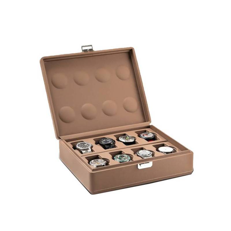 Dotée d'un cuir de couleur châtaigne, cette boîte possède une capacité d'accueil de 8 montres, possédant un diamètre de 56 mm maximum. Ses surpiqures blanches ajoutent une touche d'élégance à la boîte, tandis que son fermoir argenté garantit une sécurité. Mesurant 9 x 30.5 x 25.5 cm, avec sa poignée de transport et son format compact, soyez sûrs de pouvoir transporter votre boîte n'importe où !