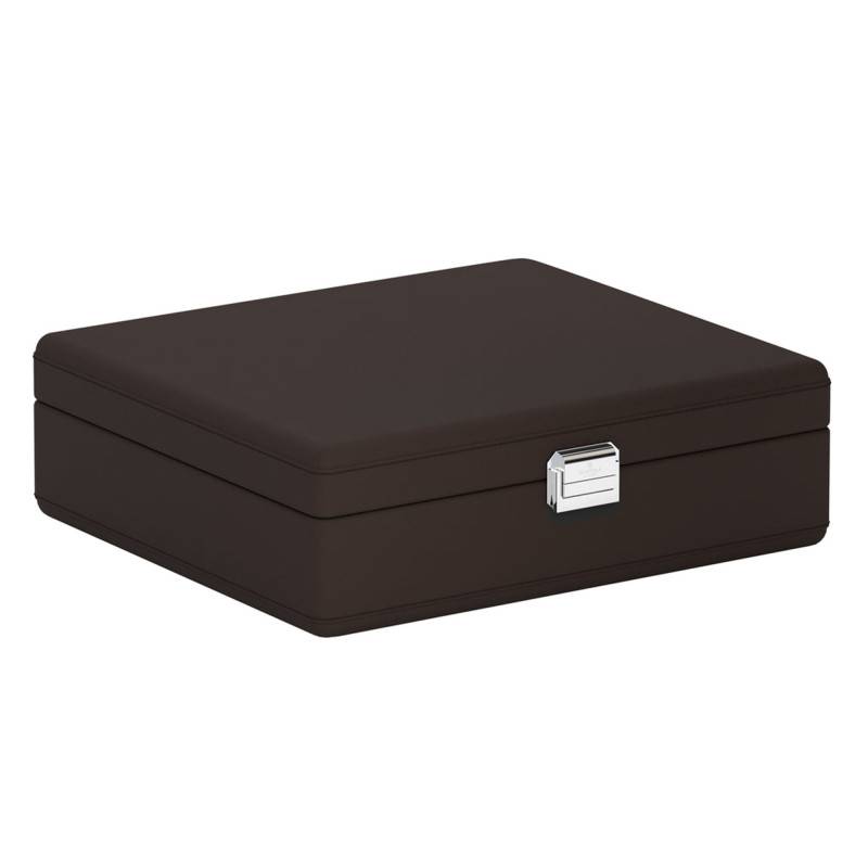 L'étui de transport présenté appartient à la collection de boîtes à montres Valigetta 8. Elle vous dévoile une boîte en cuir de couleur chocolat qui permettra aux amateurs d'horlogerie hommes et femmes de ranger ses pièces horlogères dans l'un des 8 compartiments disponibles. Vous pourrez également y intégrer des bracelets en cuir ou les bracelets adaptés à vos garde-temps. Ce modèle est fabriqué à la main en Italie et mesure 9 cm de hauteur, 30.5 cm de longueur et 25.5 cm de largeur. Il deviendra votre compagnon idéal lors de vos voyages. Enfin, vous pourrez la refermer à l'aide d'un fermoir couleur argent.