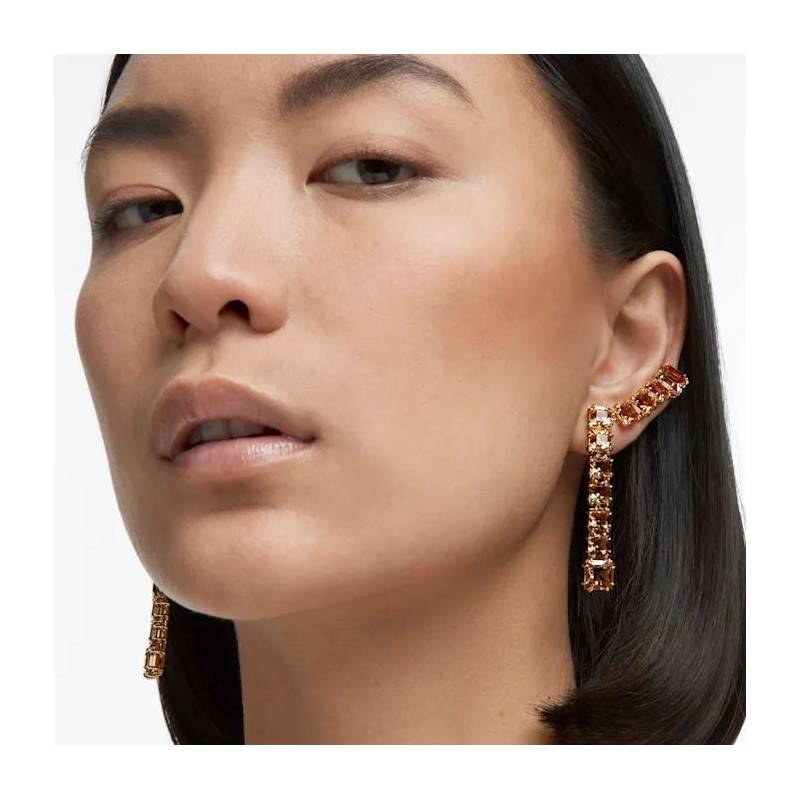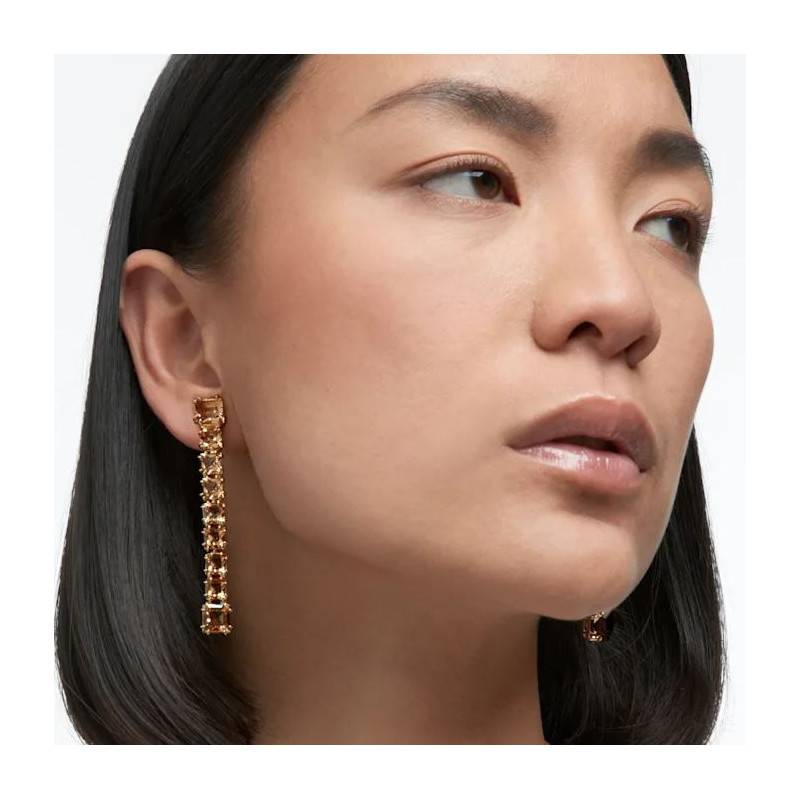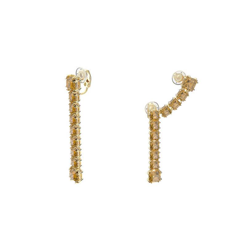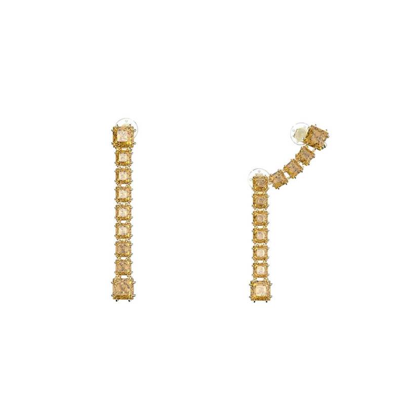 Soyez audacieuse avec cet ensemble unique de boucles d'oreilles asymétriques. Ornée de cristaux jaunes taillés en forme de carrés, cette paire est finie sur une monture classique en plaqué or. Ces boucles d'oreilles de la famille Millenia ont été imaginées par la directrice de création Giovanna Engelbert pour la collection II.