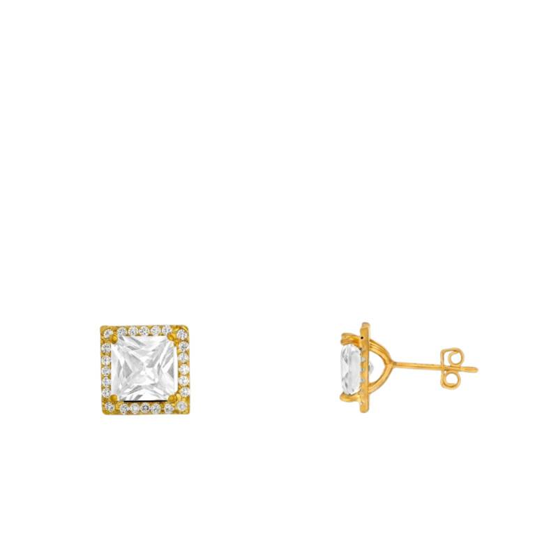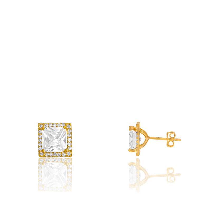 Découvrez ces Puces d'Oreilles en or jaune 375/1000 (9 carats), idéales à porter au quotidien. De forme carrée, chaque boucle mesure 9 mm de hauteur et 9 mm de largeur. Elles sont ornées d'une bordure pavée d'oxydes de zirconium blancs, mettant en valeur une pierre centrale plus imposante, sertie à griffes. Cette pierre centrale mesure 7 mm de hauteur et 7 mm de largeur, apportant éclat et relief à l'ensemble. Leur finition dorée et lumineuse sublime aussi bien les tenues simples que plus habillées. Les fermoirs poussettes papillon assurent un maintien sûr et confortable.