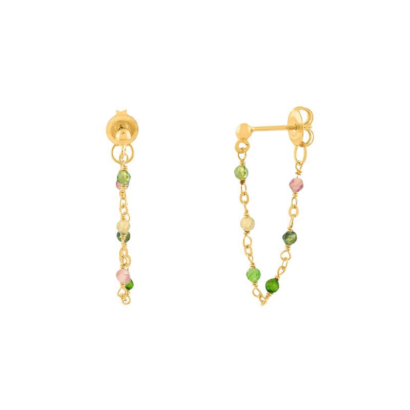 Admirez ces Boucles d'Oreilles Chaîne Dorées en Argent 925 & Tourmalines, une délicate harmonie de lumière et de couleur. Forgées dans de l'Argent massif 925/1000 pour un éclat intemporel, ces boucles arborent une finition polie et brillante. Mesurant 28,00 mm de long et pesant 1,26 g, elles se fixent facilement grâce à des fermoirs poussettes papillon. Les six pierres de tourmaline multicolores, apportent une touche de gaieté et de sophistication.