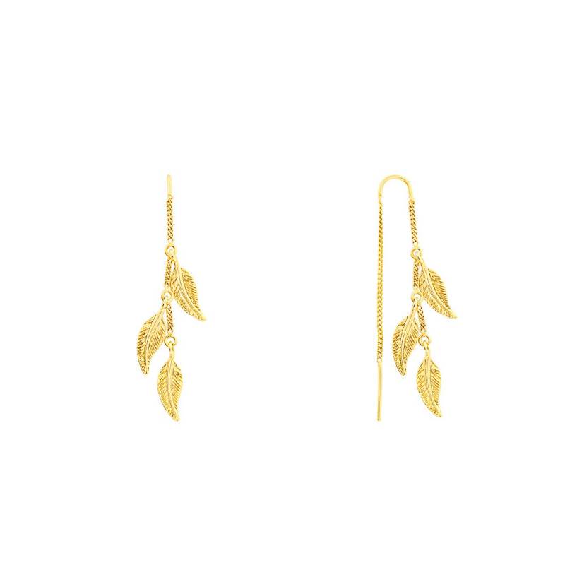 Ici Maison Ballet by Scarlett vous propose une paire de boucles d'oreilles or jaune 375/1000 (9K), des plus originales et modernes. Le bijou est composé de trois délicates plumes pendantes à l'avant de l'oreille. Le trio de plumes est maintenu par une sublime chaîne de type maille gourmette de 1 mm de largeur. Les boucles d'oreilles pendantes se composent également d'une élégante chaîne qui pend à l'arrière de l'oreille. Ce bijou sublimera à coup sûr vos tenues et vous procurera une sensation de légèreté avec son design souple et délicat.