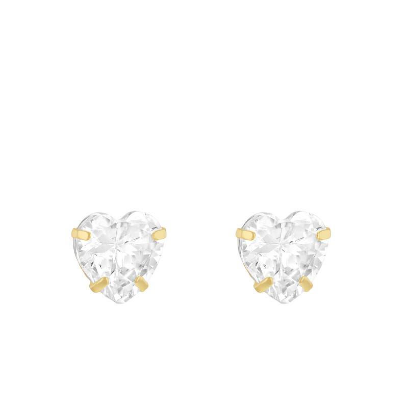 Ces élégantes boucles d'oreilles cœurs sont fabriquées en or jaune 375/1000 (9K). Elles apportent une brillance subtile avec leur finition polie. Ces puces d'oreilles présentent une forme délicate avec une largeur et une hauteur de 6,50 mm ainsi qu'une épaisseur de 4 mm pour un poids de 0,37 gramme. Ces boucles d'oreilles sont ornées de deux oxydes de zirconium de forme cœur qui présentent un éclat blanc saisissant. Ces pierres d'une taille de 6 mm sont délicatement serties à griffes, mettant en valeur leur brillance.