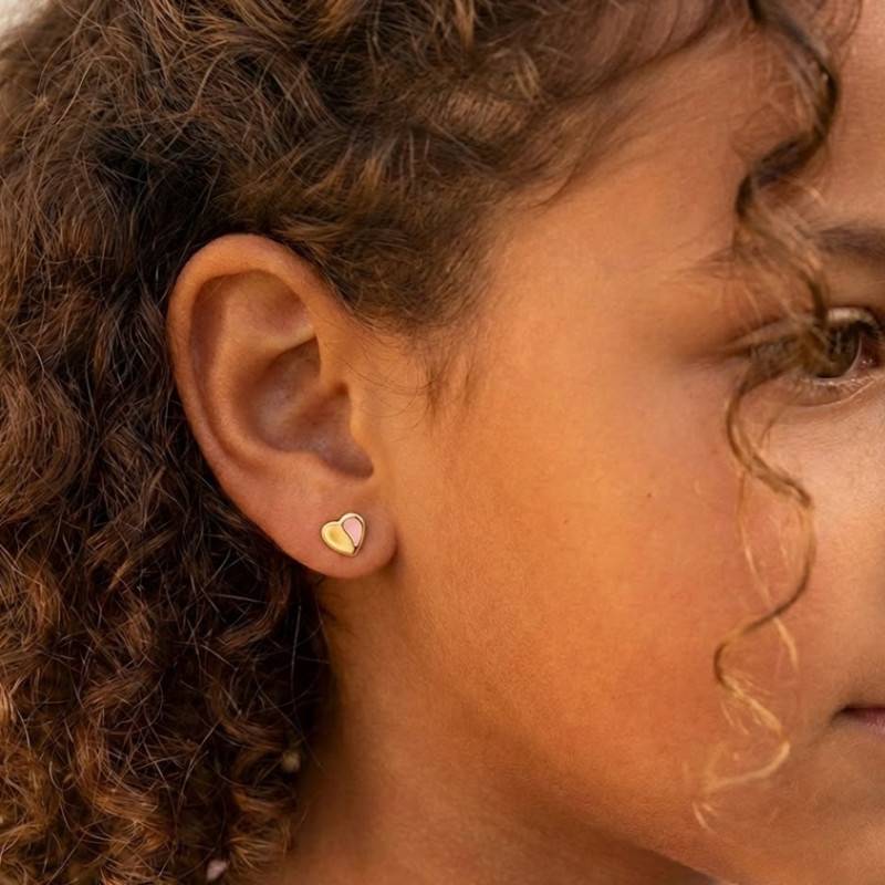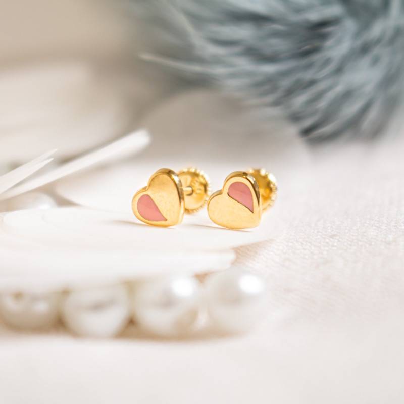 De type puces d'oreilles, leur motif central représente un cœur en or. Le cœur, affichant des dimensions de 5,50 mm x 6,50 mm, se compose d'un mélange harmonieux de couleur doré et rose. Le bijou est en or jaune avec un touche d'émail rose sur le côté du coeur. Le poids d'or moyen de ces petites boucles d'oreilles cœurs est de 0,47 gramme pour la version 375/1000 (9K). Pour la version 750/1000 (18K), le poids d'or moyen est de 0,59 gramme.