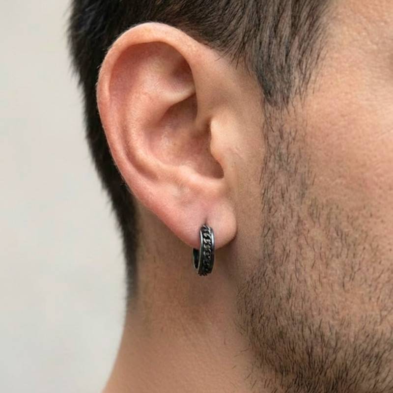 Découvrez ces Boucles d'Oreilles Créoles en Acier Inoxydable Noir & Maille Gourmette. Conçues pour l'homme moderne, ces boucles d'oreilles arborent une teinte noire ébène, rehaussée par la robustesse et la brillance de l'acier inoxydable. Leur surface polie et brillante reflète la lumière pour un éclat subtil, tandis que leur design à maille gourmette rend ces créoles modernes. Avec un diamètre de 9 mm et un poids total de 3,82 g, elles se fixent avec fermeté grâce à leur fermoir cliquet.