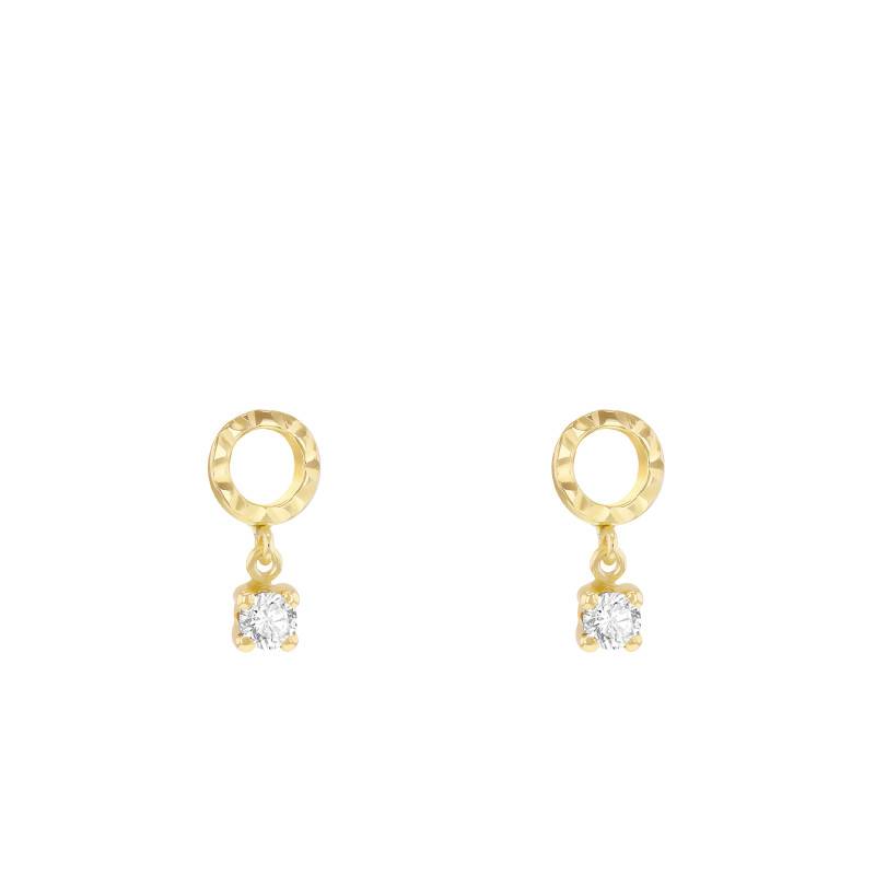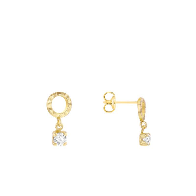 Dévoilez votre beauté avec ces boucles d'oreilles au design diamanté conçues en or jaune 375/1000 (9K) poli. Ces pendantes d'oreilles sont ornées chacune d'un oxyde de zirconium blanc de forme ronde. Cette pierre dispose d'un diamètre de 3 mm et est sertie à griffes pour un maintien sécurisé et une brillance accentuée. Ces boucles d'oreilles sont le bijou parfait pour apporter une touche lumineuse et élégante à vos occasions spéciales ou à votre quotidien. Elles mesurent 6 mm de largeur et 12,25 mm de hauteur pour un poids de 0,64 gramme. Leur épaisseur varie de 2,60 mm à 1 mm, créant un effet délicat et moderne.