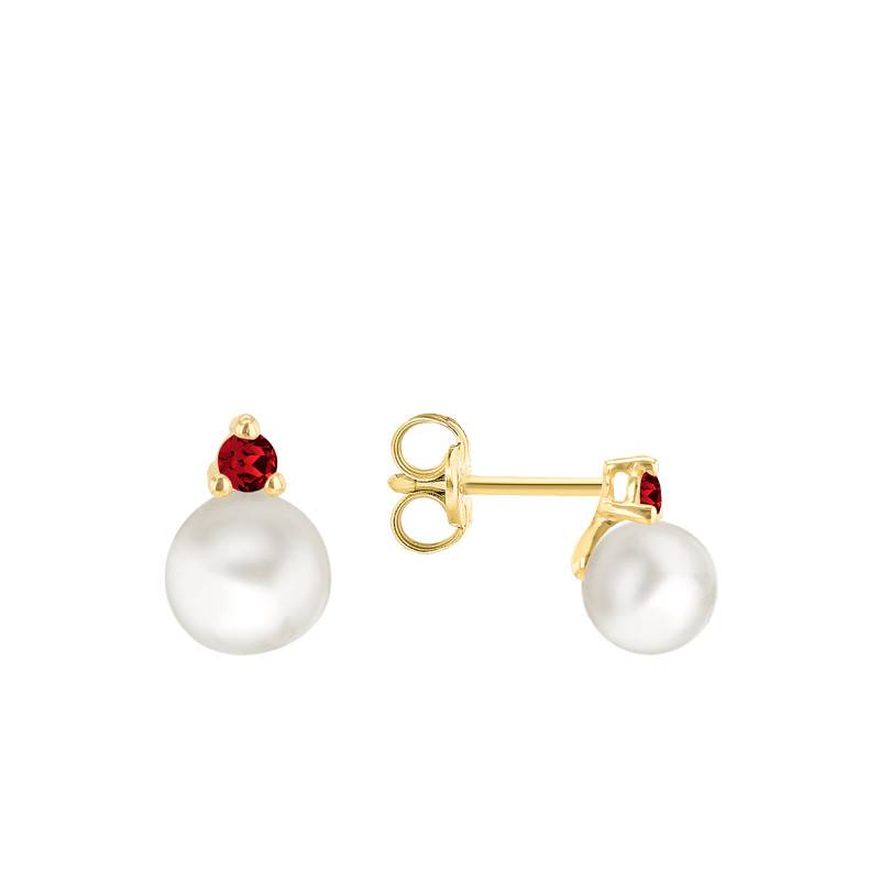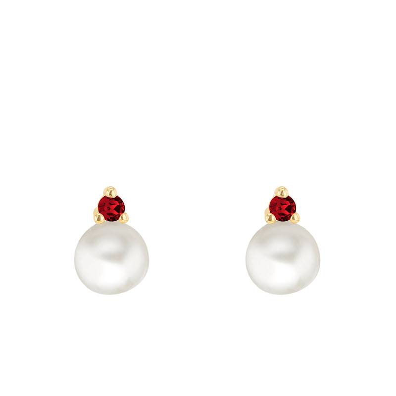 Cette paire de boucles d'oreilles est élaborée avec soin pour vous sublimer au quotidien. Fabriquées en or jaune 750/1000 (9K), elles sont magnifiées par une finition polie et se composent chacune d'une perle d'eau douce blanche. Accordant une belle allure à ces belles boucles, elles mesurent 5,50 mm de diamètre et sont soutenues par une base sertie à griffes d'un oxyde de zirconium rouge de 2 mm de diamètre. Resplendissantes, ces gemmes apportent une touche d'éclat supplémentaire au bijou et de la couleur pour une allure distinguée. C'est le bijou idéal qui vous rendra élégante. Épurée et légère, cette paire de boucles d'oreilles présente une largeur de 5,50 mm sur une hauteur de 8 mm.