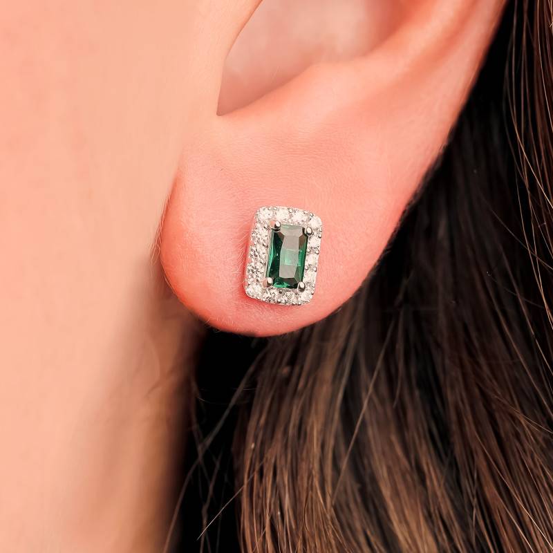 Ces Boucles d'Oreilles Rectangulaires en Or Blanc 375, ornées de deux émeraudes et de oxydes de zirconium cubiques blancs, capturent la lumière avec une intensité hypnotique. Les pierres vertes rayonnantes, serties griffes, sont sublimées par l'éclat des oxydes de zirconium en sertis clos, déposées délicatement sur un écrin d'or blanc. Offrant un éclat polie et brillante, chaque pièce pèse 0,89 g. D'une hauteur de 8 mm et d'une largeur de 6 mm, ces boucles d'oreilles enveloppent l'oreille de leur doux embrasement cristallin.