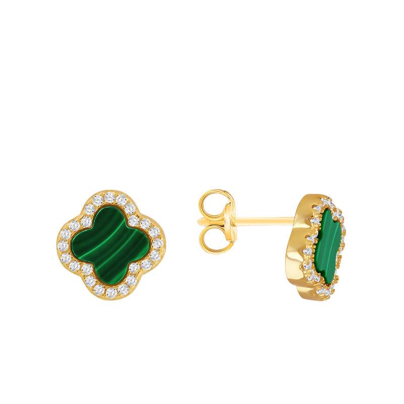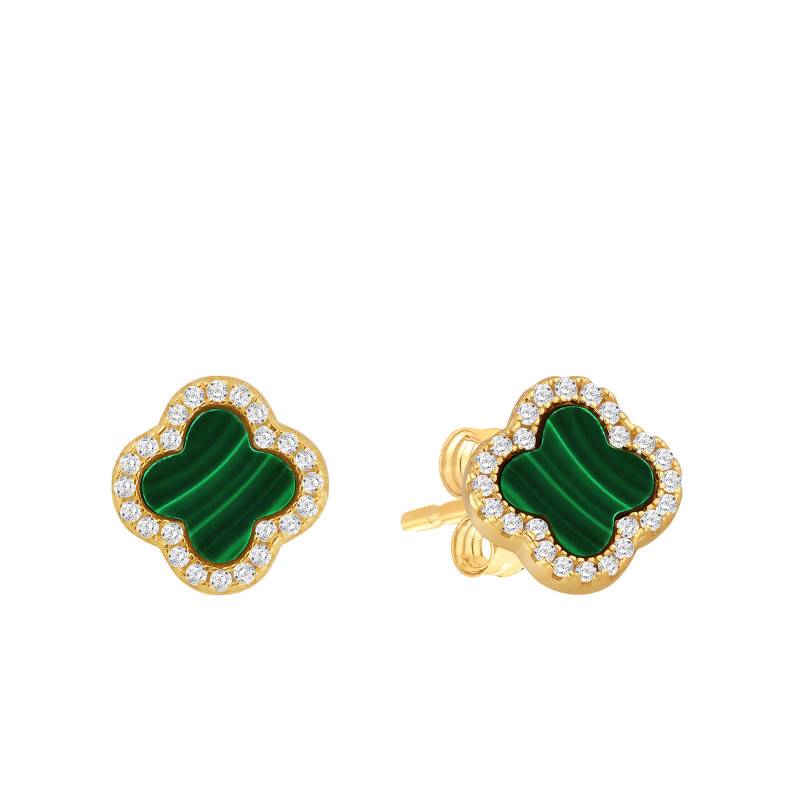 Splendides, ces boucles d'oreilles trèfles sont de magnifiques bijoux qui vous ajouteront une belle élégance et une touche très féminine. Elles sont conçues en argent 925 doré et sublimées par une finition polie qui leur confère une brillance attrayante et noble. Magnifiques, ces boucles possèdent chacune une poussette papillon en guise de fermoir et peuvent s'adapter agréablement à toutes vos tenues. Chacune se compose d'un trèfle, symbole de chance, agrémenté d'une malachite verte de 8 x 8 mm reflétant des nuances de vert envoûtantes. Cette pierre est entourée par un ensemble de 12 oxydes de zirconium blancs de 1 mm de diamètre qui favorisent davantage son raffinement et créent un contraste subtil. Chaque puce affiche une taille de 11 x 11 mm et une longueur de 12 mm, y compris la tige.