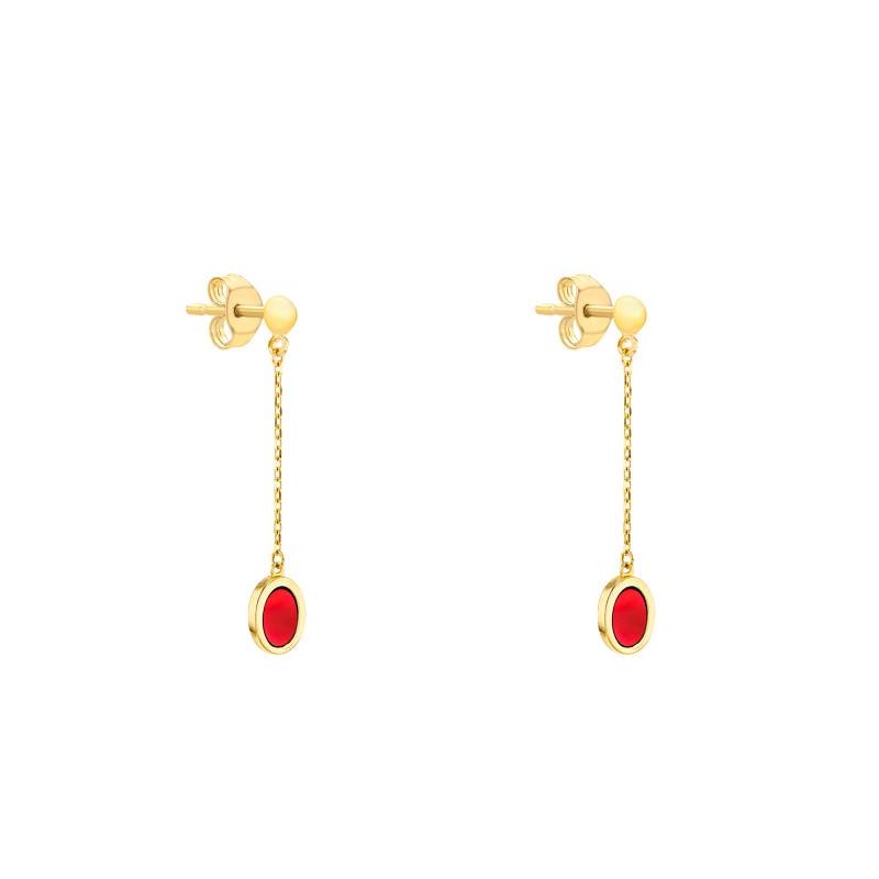 Ces belles boucles d'oreilles ovales se parent d'une couleur dorée qui leur apporte une touche de raffinement. Ces pendantes d'oreilles sont entièrement faites avec de l'or jaune 375/1000 (9K) poli pour garantir leur durabilité. Celles-ci se ferment au moyen de poussettes papillon et elles mesurent 37,50 mm de hauteur et 6 mm de largeur. Ces boucles d'oreilles sont dotées chacune d'une chaînette en maille forçat qui retient un motif ovale sertis clos de cornaline rouge. Cette pierre attractive mesure 4,50 mm de largeur et 7 mm de longueur.