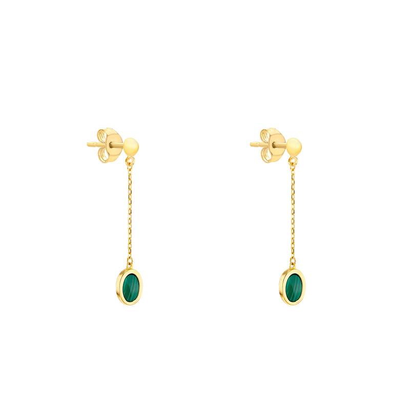 Ces belles boucles d'oreilles ovales mettront chaque femme en valeur grâce à leur design sophistiqué. De couleur dorée et de finition polie, elles se composent d'or jaune 375/1000 (9K) qui assure leur bonne tenue au fil des ans. Ces pendantes d'oreilles comprennent chacune une chaînette en maille forçat et un motif ovale sertis clos de malachite verte. Cette pierre aide à ouvrir et à équilibrer le chakra et elle mesure 4,50 mm de largeur et 7 mm de longueur. Notez que ces boucles d'oreilles peuvent se porter avec des tenues élégantes lors des occasions spéciales en se fermant aisément via des poussettes papillon. Leurs dimensions sont de 37,50 mm de hauteur et 6 mm de largeur.