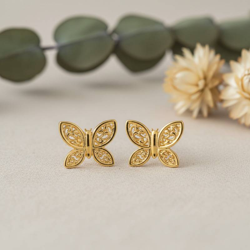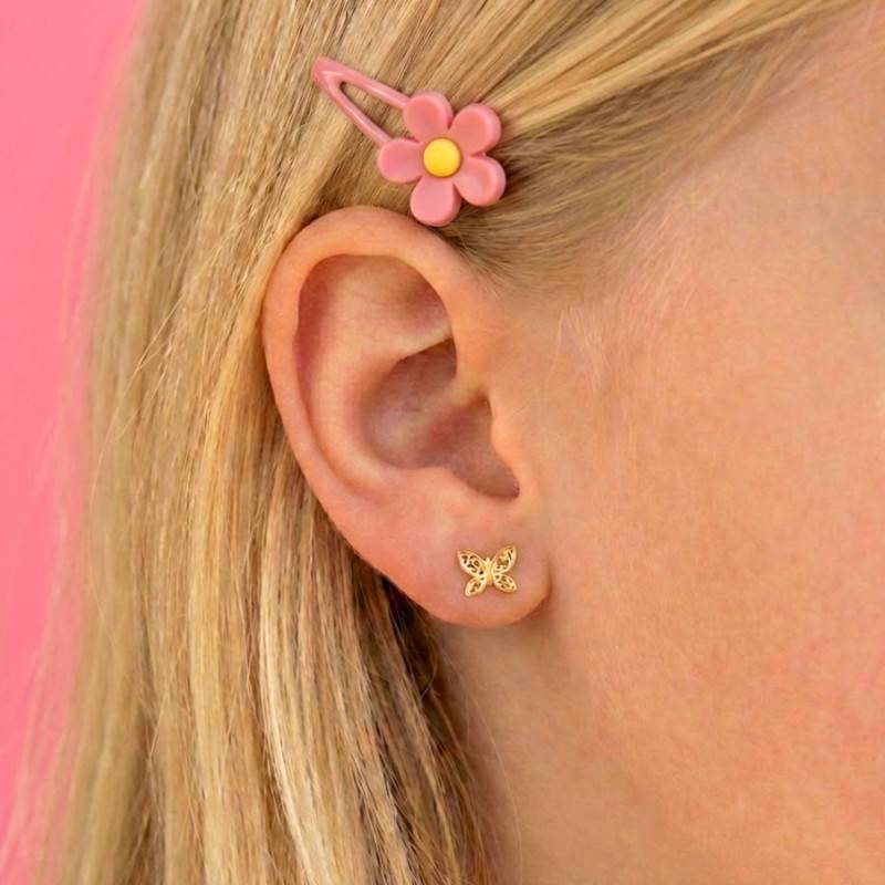 Ces puces d'oreilles en forme de papillon transporteront les enfants sous un ciel ensoleillé au printemps. Ces papillons en or jaune sont ajourés ce qui leur donne un côté raffiné et plus de grandeur. Aux dimensions de 6 x 7 mm, ce bijou épousera parfaitement le lobe votre enfant. La version 375/1000 (9K) de ces puces d'oreilles affiche un poids d'or moyen de 0,30 gramme et la version 750/1000 (18K) affiche un poids d'or moyen de 0,43 gramme.