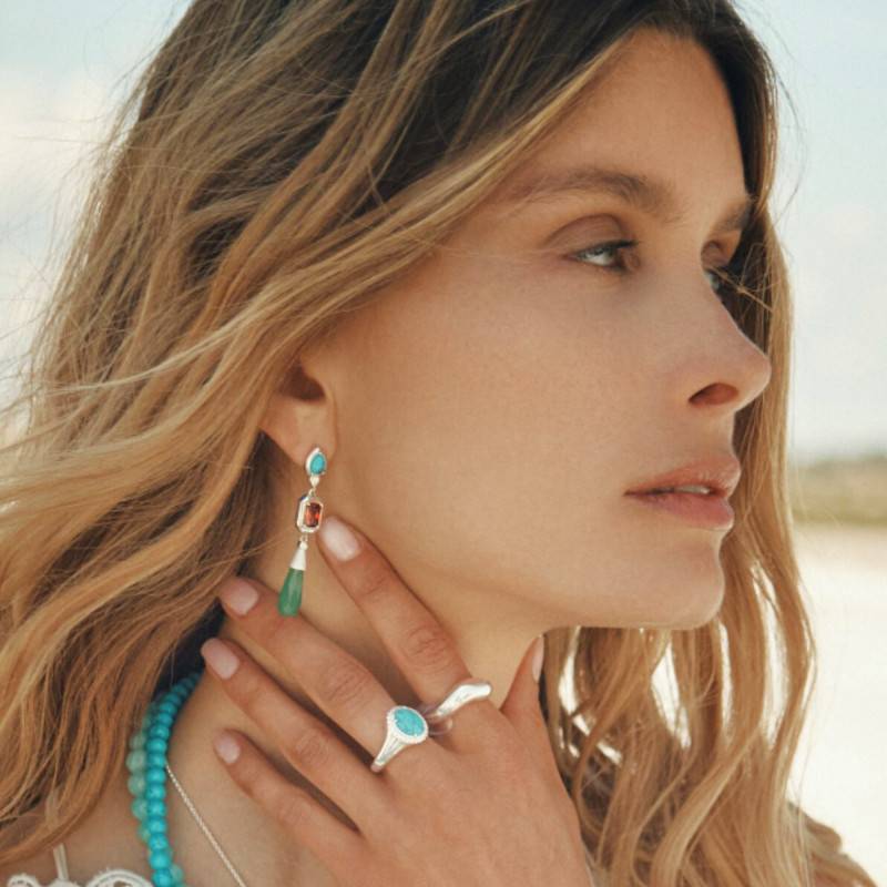 Les Boucles d'Oreilles Pendantes Elyndra sont un hymne à la couleur et à la lumière. Confectionnées en Argent massif 925/1000 avec une finition polie et brillante, elles captivent immédiatement par leur éclat. Les pierres multicolores, une harmonieuse alliance d'agate, imitation turquoise, oxyde de zirconium et zircon, illuminent le visage de nuances de blanc, bleu, rouge et vert. Ces boucles, mesurant 8 mm de largeur et 50 mm de hauteur, dansent avec un charme enchanteur à chaque mouvement.