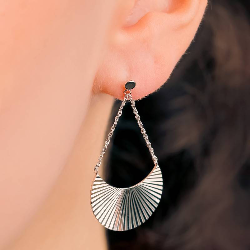 Ces Boucles d'Oreilles Pendantes en Argent 925 captivent par leur design inspiré d'un éventail délicat, une danse de lignes et de lumière en argent massif 925/1000, offrant une couleur grise subtilement polie pour une brillance enchanteresse. Chaque boucle est munie d'un fermoir poussette papillon assurant confort et sécurité. Avec un poids total de 4,80 g, ces créations enchanteront l'âme et sublimeront votre allure.