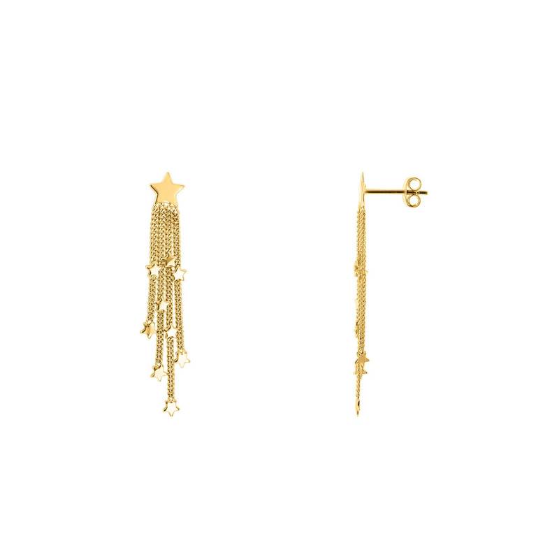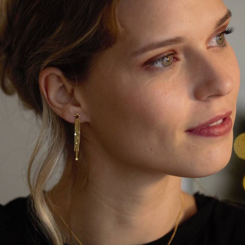 La marque Maison Ballet by Scarlett vous dévoile ces gracieuses boucles d'oreilles or jaune 375/1000 (9K). Elles sont composées d'un dégradé de chaînes ornées à chaque extrémité d'une étoile de 1.50 mm. Notez que le motif étoile de 4 x 4 mm compose la puce de base de ce bijou. Chaque chaîne possède des longueurs différentes soit : 20 mm, 25 mm, 20 mm, 15 mm. De plus, le poids d'or moyen de ce bijou est de 1.25 gramme. Enfin, vous pourrez fermer vos boucles à l'aide d'un fermoir de type poussette papillon qui est garant d'une sécurité.
